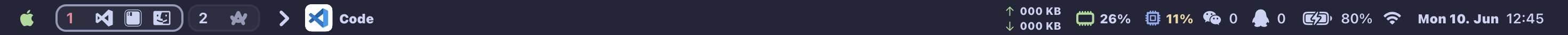 左侧菜单栏还有桌面显示,如下图,我现在第一个桌面有vscode、访达和iterm,第二个桌面有arc浏览器