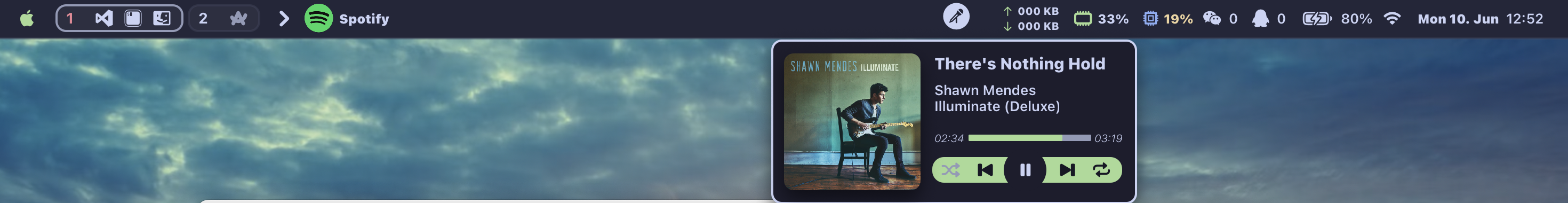 右侧菜单栏从左到右依次为Spotify控制器、网络监视、内存监视、CPU监视,微信消息数、QQ消息数、电池、WI-FI、日期