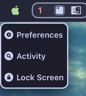 目前菜单栏的功能:最左侧的苹果图标点击后可显示如下三个选项,第一个是打开系统设置,第二个是打开活动监视器,第三个是锁屏(脚本是通过运行快捷键Control + Command + Q,请注意自己电脑锁屏快捷键是否为当前这个)